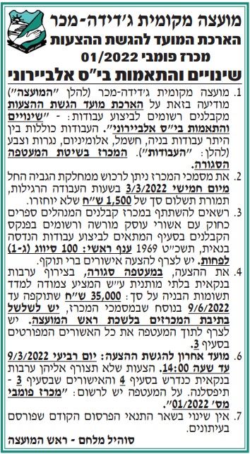 | מכרז שיפוץ בית ספר אלבירוני | 03/03/2022 | 09/03/2022 15:00 | כללי |
